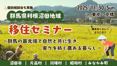 - 群馬県北部の利根沼田地域(沼田市、片品村、川場村、昭和村、みなかみ町)共催による移住セミナーを東京都・京橋で開催します。